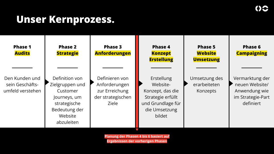 Ein erfolgreicher Website Relaunch braucht Struktur. Unser Relaunch-Kernprozess führt Schritt für Schritt zum Ziel und sorgt für klare Entscheidungen, für die Bauchgefühl alleine nicht reicht. Mit unserem flexiblen Prozess setzen wir da an, wo euer Unternehmen gerade steht. Falls einige Schritte schon vor unserer Zusammenarbeit erledigt wurden, ziehen wir die Ergebnisse mit in Betracht. Unser kompletter Kernprozess besteht aus folgenden Phasen: